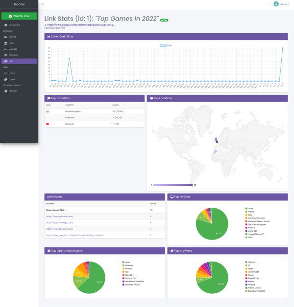 Advanced analytics for each individual link, including geo and device information, referrers, browser, ip and more.